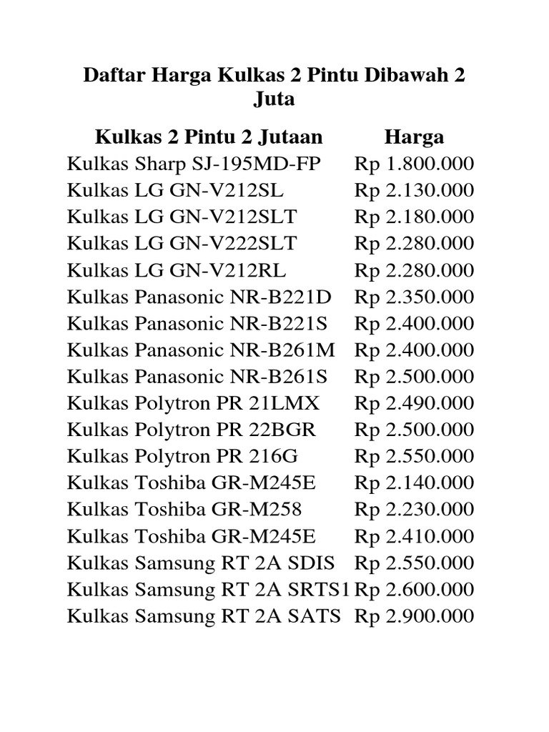 Daftar harga kulkas lemari es samsung 2 dan 1 pintu terbaru. Mau tahu tipe apa saja yang dibuat lg ini, silahkan dilihat katalog harga nya di bawah ini Dijaman sekarang sudah hampir semua rumah tangga sudah memiliki apa itu yang bernama kulkas. Apalagi dengan harganya, pastinya harga kulkas 2 pintu lebih mahal dari jenis kulkas 1 pintu. Kulkas 2 pintu hemat listrik lemari es teknologi inverter, sekarang banyak harga kulkas 2 pintu terbaru murah seperti lg, hitachi, sharp, toshiba dan samsung.